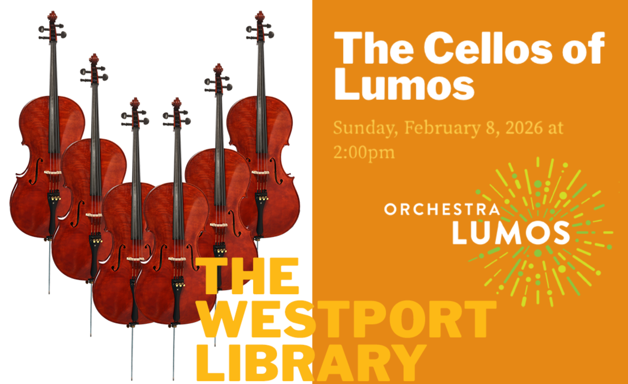 Six Orchestra Lumos cellists, 24 strings, and one amazing sound! Enjoy the deep, resonant beauty of the cello in this intimate performance in the Library's Trefz Forum — from Baroque elegance to Brazilian rhythms to timeless pop classics.