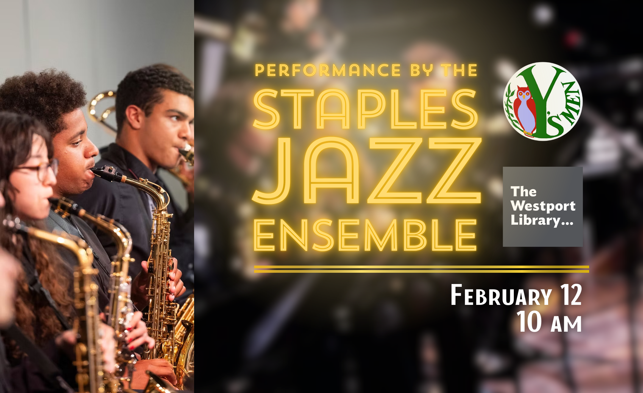 In partnership with Y's Men, The Staples High School Jazz Ensemble will perform a set in The Westport Library's Trefz Forum at 10 am on February 12th.