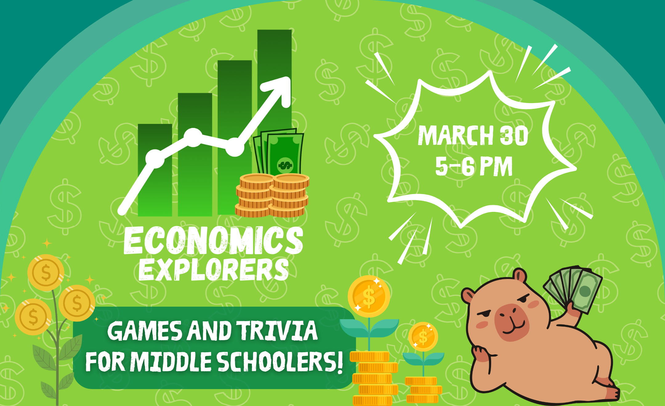 Economics Explorers is a fun and educational program designed for students in Grades 4-8 that teaches basic economics and financial concepts through games and activities! Participants will learn about concepts like opportunity cost, pricing, investing, and more!